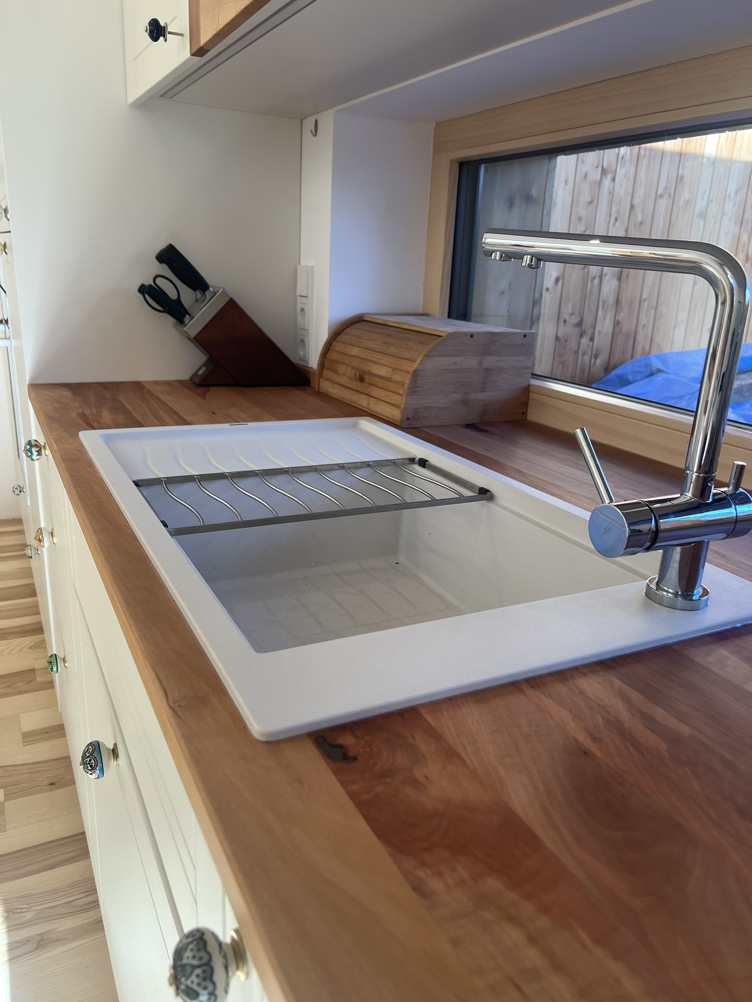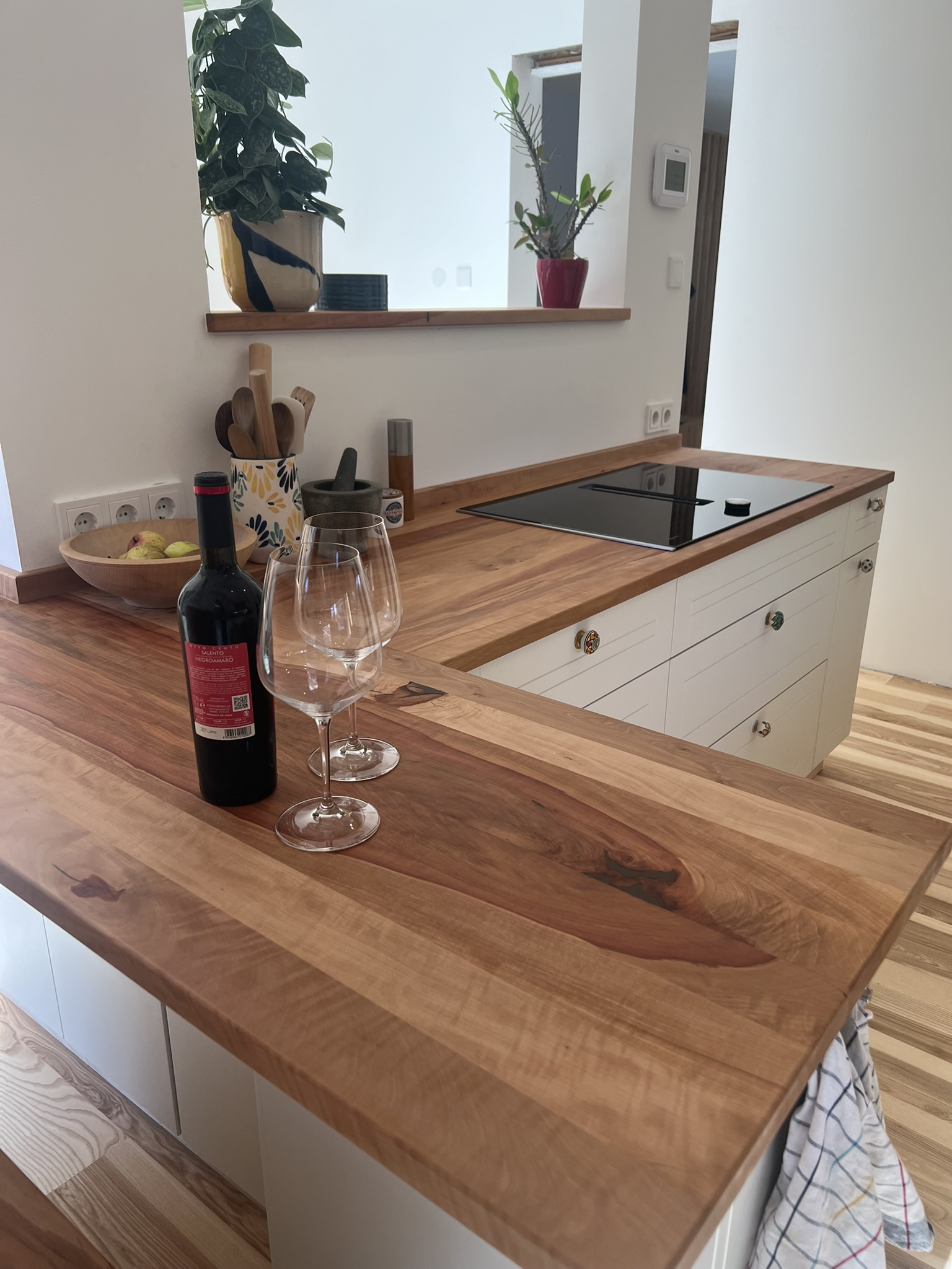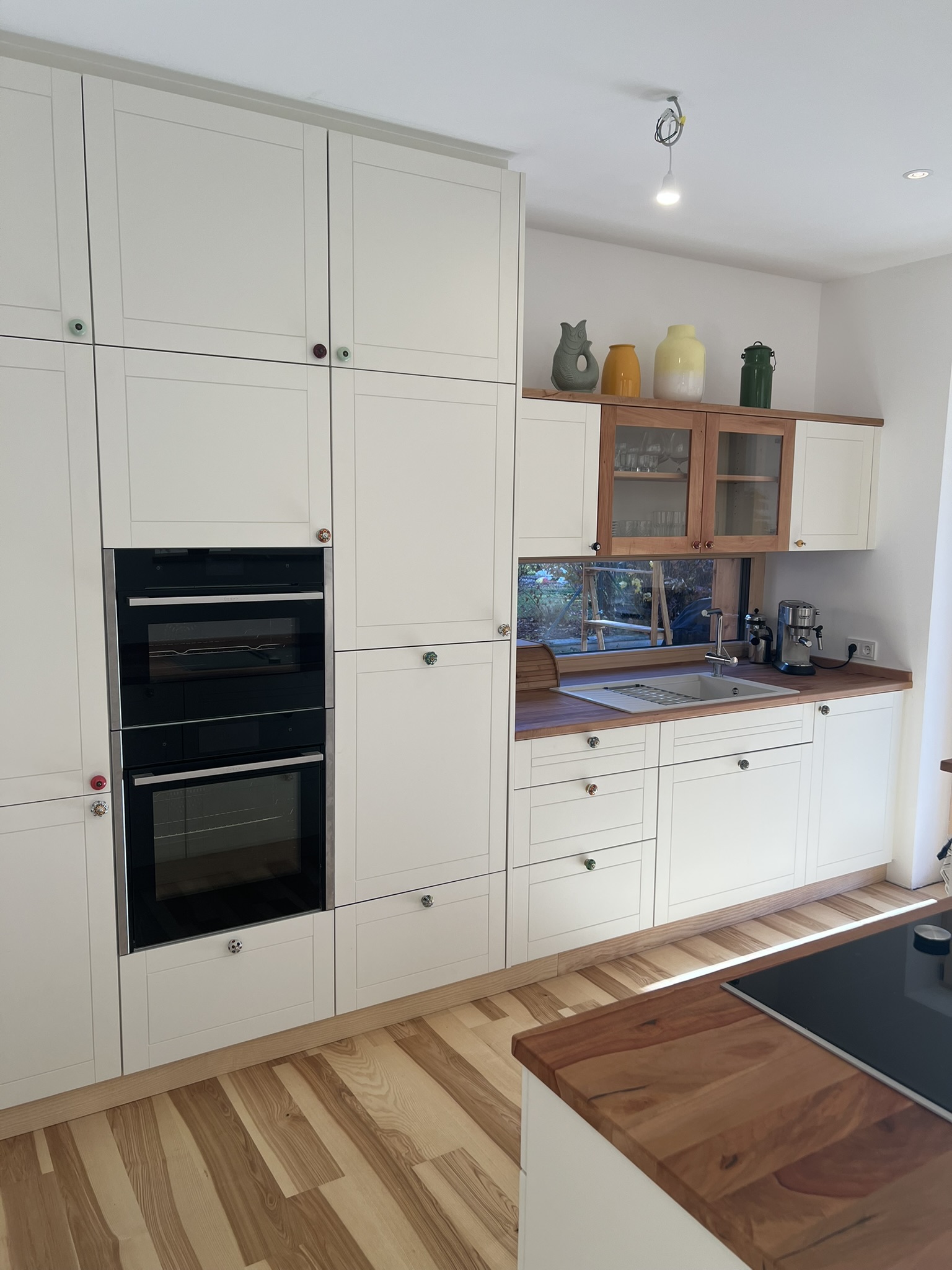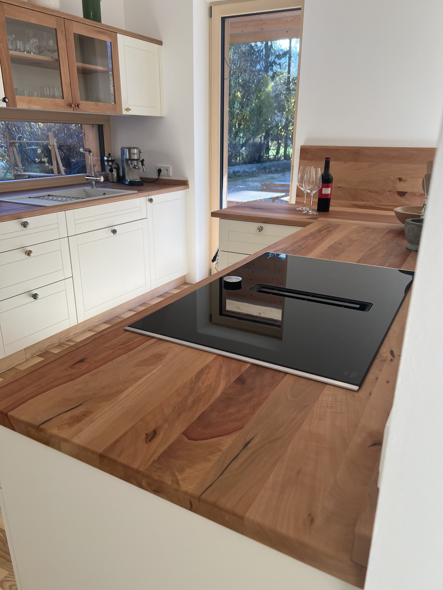 Die Küchenarbeitsplatte wurde aus massivem Birnenholz gefertigt und das einzigartige dabei, der Baum stand vorher auf dem Grundstück. Wir trockneten die geschnittene Ware und fertigten 1,5 Jahre später die Küche!